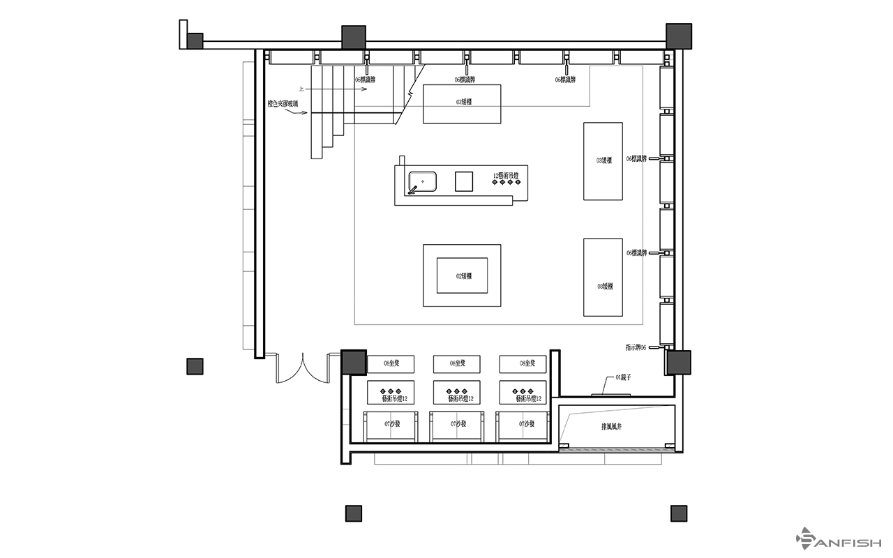 入口處直通夾層做了大幅的挑空,用絲織材料做的吊件裝置,貫穿了挑空區(qū)域,為整個(gè)空間定調(diào)。