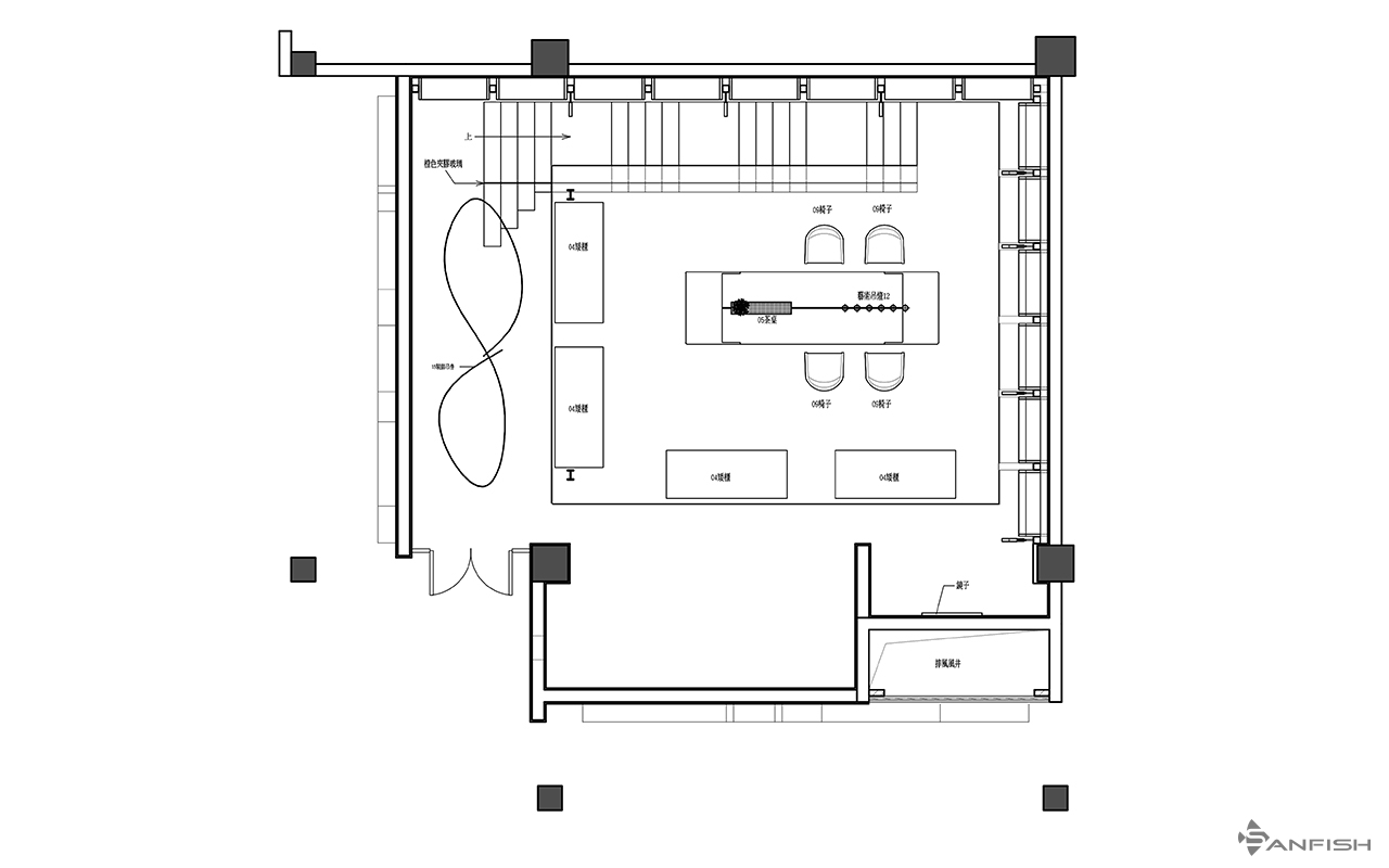 大面積的橙色玻璃使得現(xiàn)場空間更具張力。
